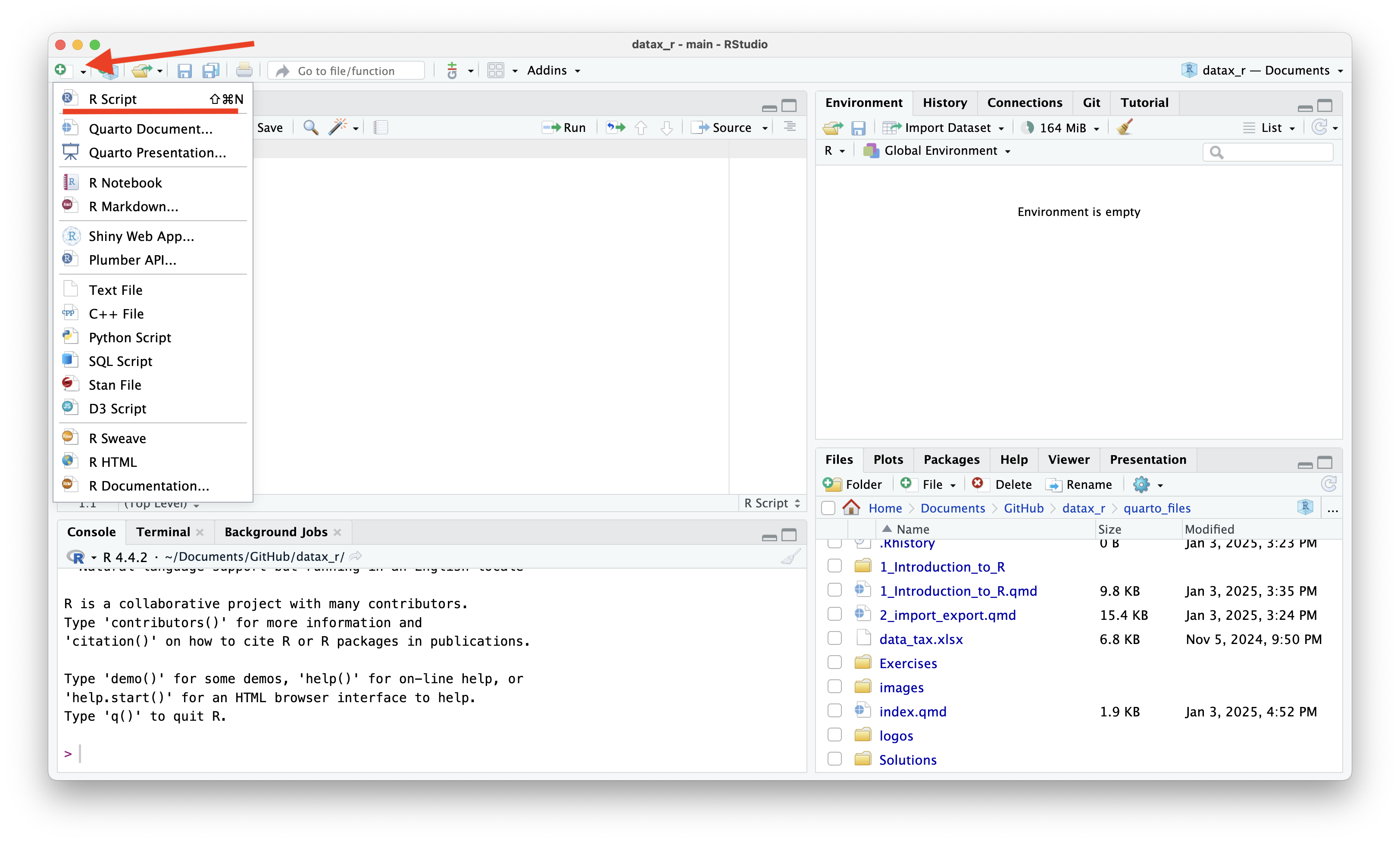Puedes usar la barra de menú o Ctrl + Shift + N para crear nuevos scripts de R.
