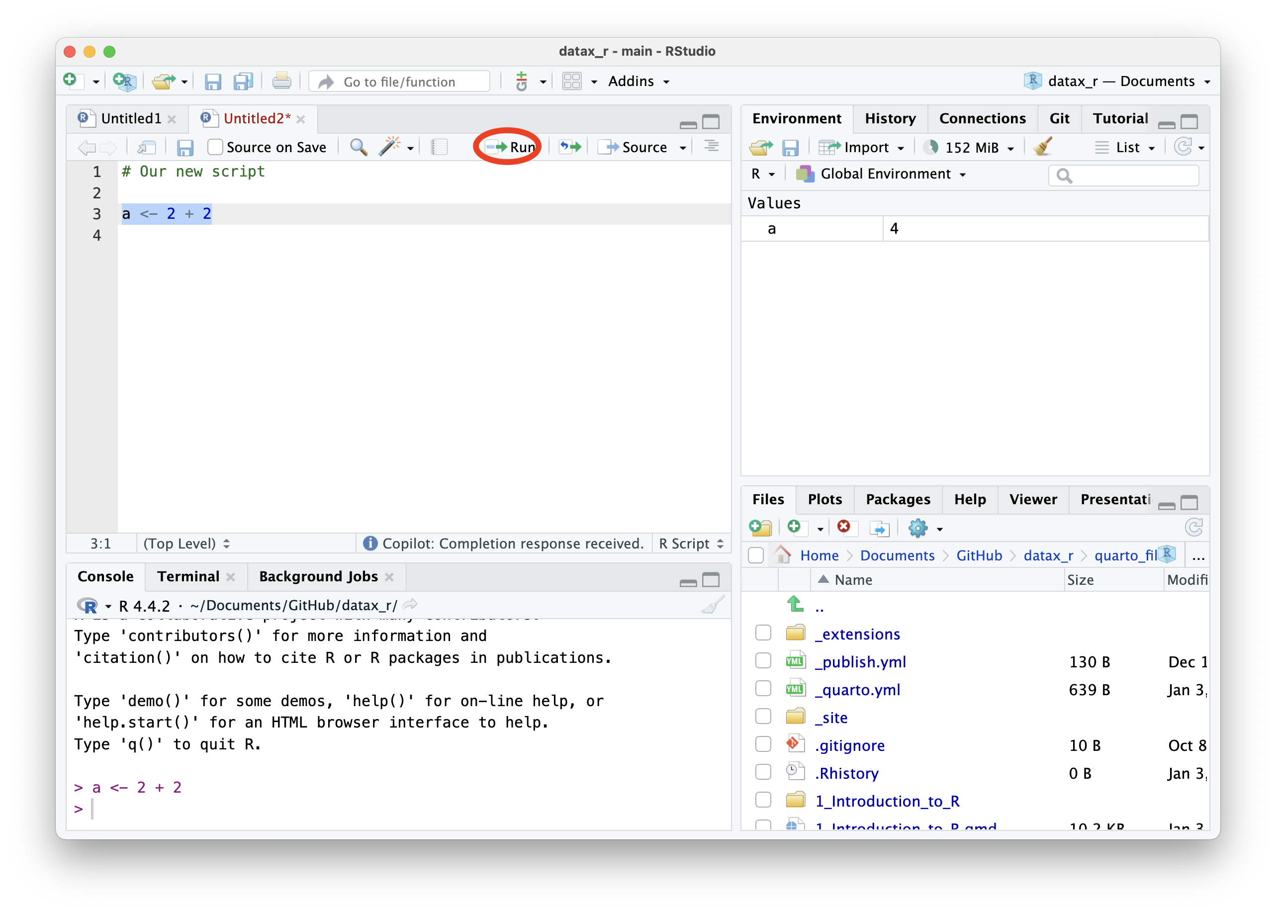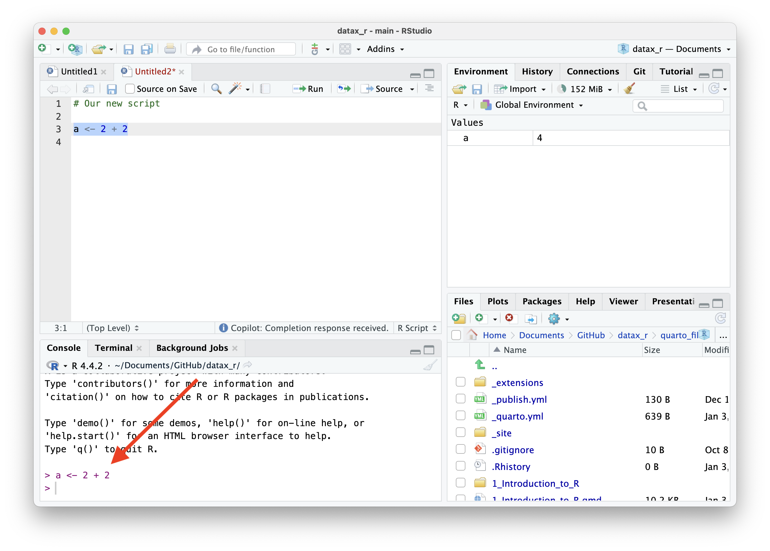 Para ejecutar un comando, escríbelo en el panel Source y presiona Ctrl+Enter (Windows) para ejecutarlo en la Consola.