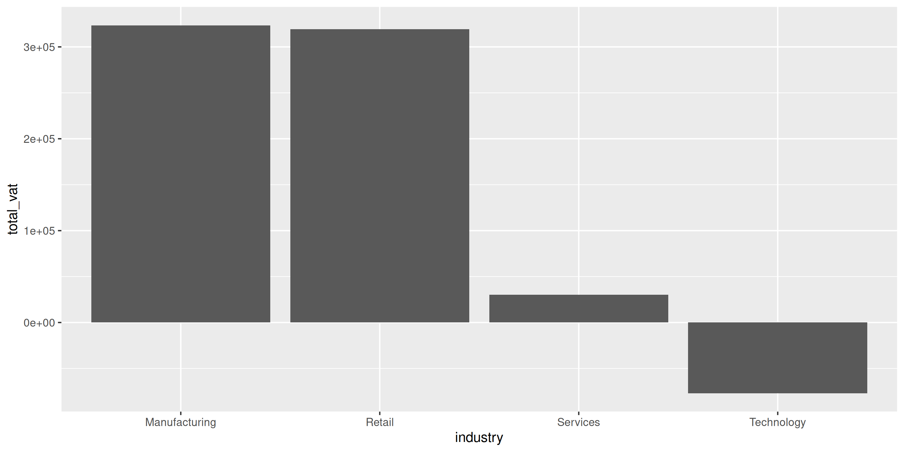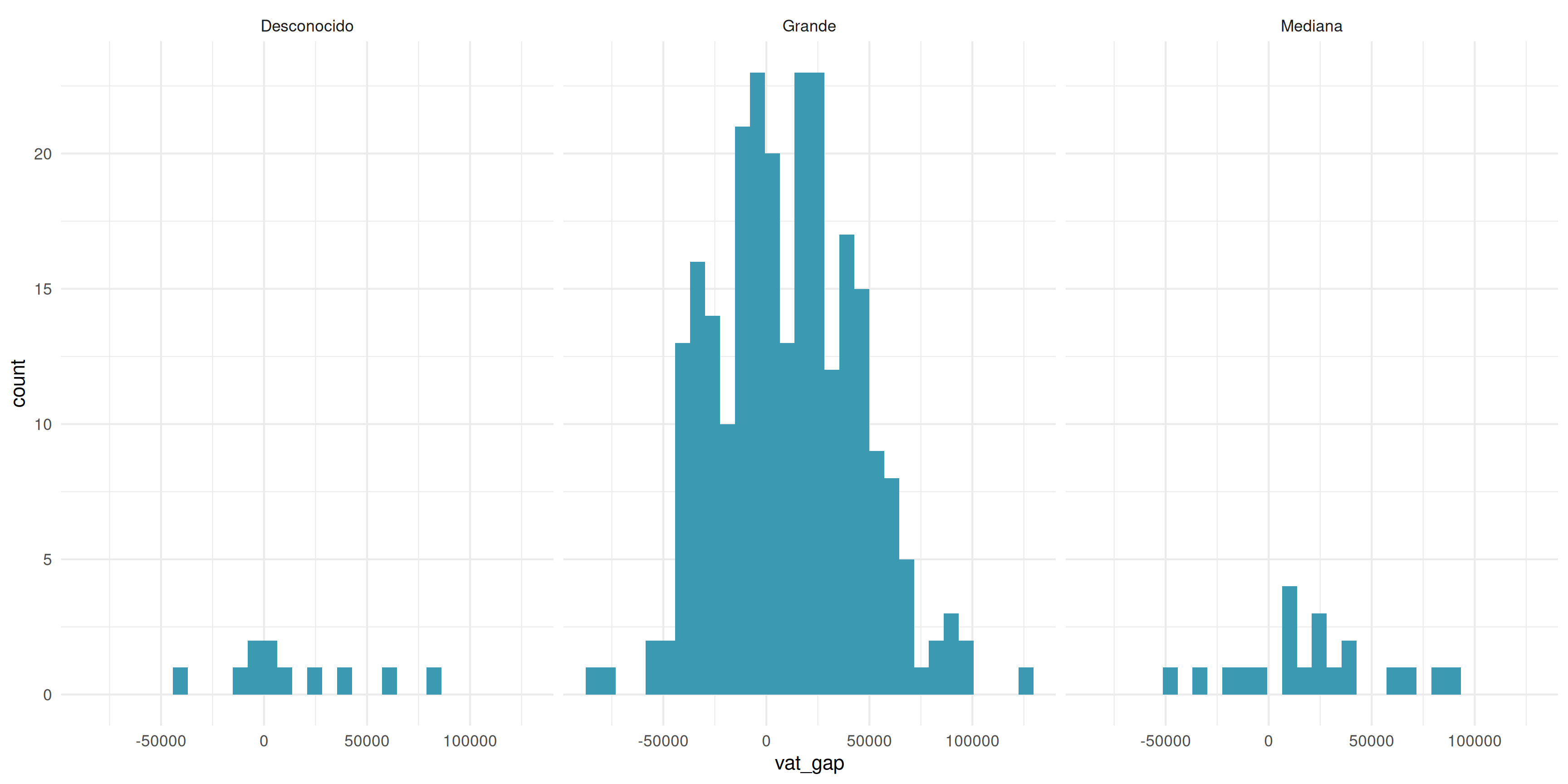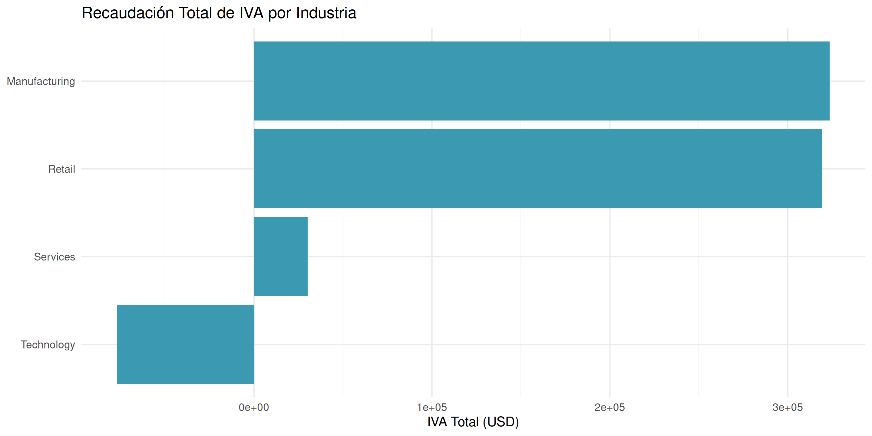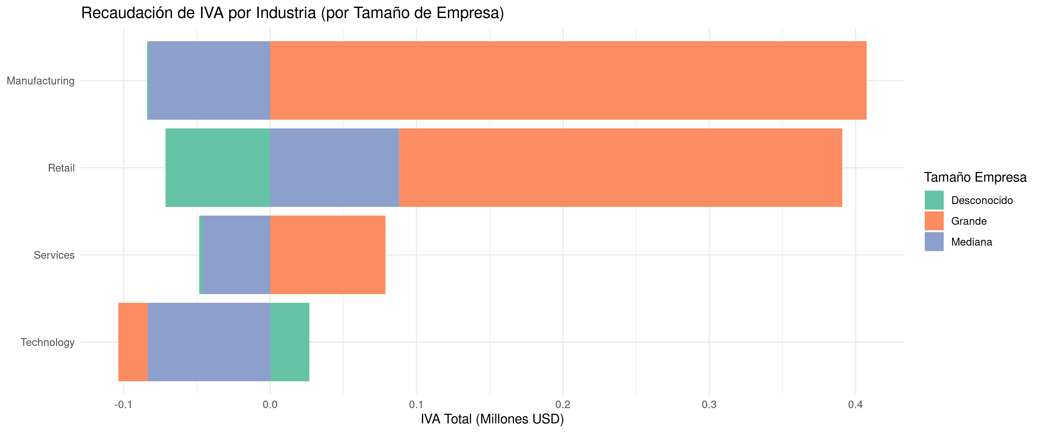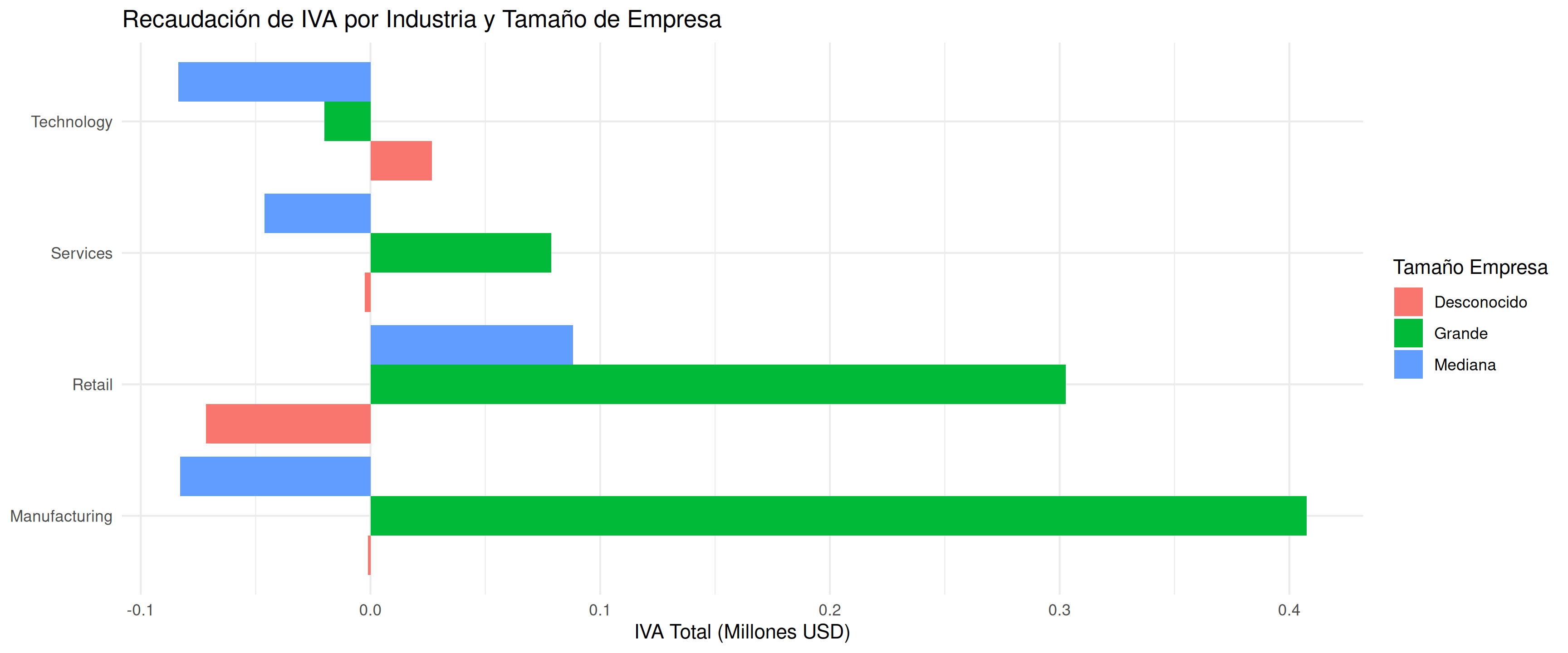 actual_vat por industry Y firm_sizeindustry en eje x, total_vat en eje yfill = firm_size para colorear barras por tamaño de empresaposition = "dodge" para hacer barras lado a ladocoord_flip()theme_minimal()Pregunta: ¿Qué combinación (industria + tamaño de empresa) recauda más IVA?