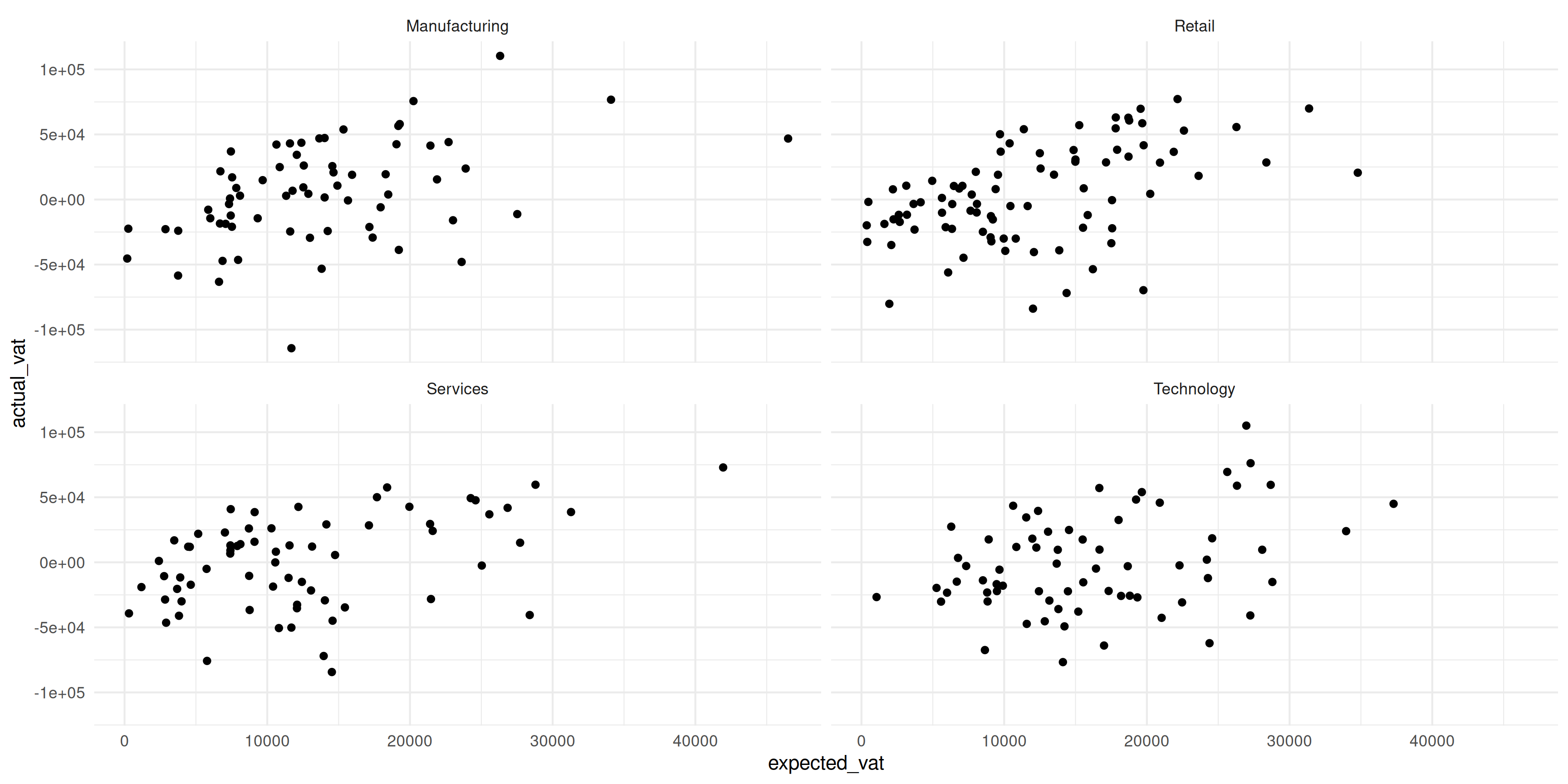 taxable_income vs actual_vatgeom_point()facet_wrap(~ industry)geom_smooth(method = "lm")Siempre incluir: